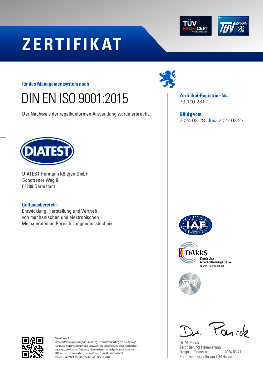 Zertifikat – Die TÜV CERT-Zertifizierungsstelle der TÜV Hessen bescheinigt gemäß TÜV CERT-Verfahren, dass das Unternehmen DIATEST Hermann Költgen GmbH, Schottener Weg 6, D-64289 Darmstadt ein Qualitätsmanagementsystem für den folgenden Geltungsbereich eingeführt hat und anwendet:Entwicklung, Herstellung und Vertrieb von mechanischen und elektronischen Messgeräten im Bereich Längenmesstechnik.. Durch ein Audit, Bericht-Nr. 4381 9075 wurde der Nachweis erbracht, dass die Forderung der DIN EN ISO 9001 : 2015 erfüllt sind.